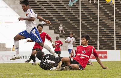 Although his team lost 3-nil to Naga in yesterday afternoon's midweek Cambodia Premier League fixture at the Olympic Stadium, I was relieved to see goalkeeper Samreth Seiha back between the posts for the National Defense Ministry team. Seiha (right) is a brilliant young goalkeeper, brave, agile, a great shop stopper, in my opinion the best I've seen in the whole of the CPL and his absence from the league campaign until yesterday has been a scandal. We need the country's best players playing regularly to give the new national coach Scott O'Donell the chance to select his best under-23 team for the SEA Games later this year, as that team will form the basis of the national team going forwards. And Seiha is the best. He's still only 19 years old, has been a national team regular for a while now and O'Donell rates him as highly as I do. I hope the stupidity that saw him sidelined for the first few games this season is now forgotten and he, and his fellow Defense Ministry striker Khim Borey, can be left to get on with doing what they do best, stopping and scoring goals. I wrote about Seiha during last year's Suzuki Cup games and here's my article. I would still love him to get some top-notch professional coaching under his belt, and my choice would be in the UK. It would be immensely valuable to him and the national team if he could spend a whole pre-season with a top club in the Premiership, and if I had the cash I'd send him there. I want us to think outside the box about how we can raise the standard of the national football team and if that means seeking a sponsor from the rich land-owning classes here, then so be it. I'm not proud.Labels: Cambodia football, Samreth Seiha, Scott O'Donell