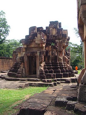 I was elated to visit Prasat Ta Muen Thom, a temple which virtually straddles the Cambodian-Thai border and which the two countries dispute ownership, last October whilst touring Isaan, but at the same time, devastated by the destruction that had taken place, robbing the temple of all of its carvings and sculptures, leaving just a shell of its original form. Built in the 11th century and reconstructed by the Thai art department in the 1990s, the temple unusually faces south and was located on a royal road that passed through the Dangrek mountains in the dim and distant past. The southern gopura greets you after climbing the laterite steps that lead down to the Cambodian border. There are other buildings in sandstone and laterite, a collapsed central tower and a natural linga hewn out of the rock base in the center of the shrine. In fact, the temple was built on top of a natural rock platform and another interesting feature is a rock channel for draining the waters poured over the linga. There are also extensive surrounding galleries but it's the complete lack of lintels and pediments as well as the destroyed devata and dvarapalas to be found on the walls that are the most upsetting. For the time being the Thai Army are fully in control of the temple even though Cambodia lays claim to temple. It was Thai Rangers who were patrolling the site, fully armed, whilst a couple of Khmer soldiers had wandered over the border to exchange pleasantries and cigarettes with their Thai counterparts.