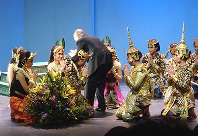 King Norodom Sihamoni thanks Sam Savin personally on stage after the performance